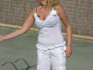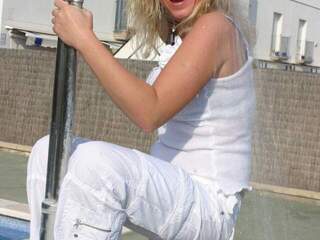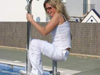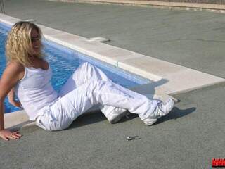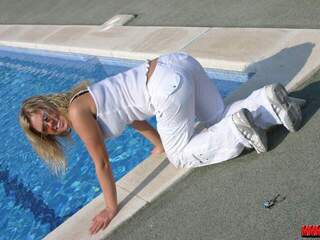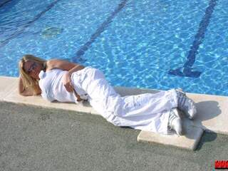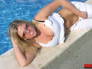 Galerie photo de Electra : La très excitante blonde à gros seins Electra fait un strip à coté de la piscine